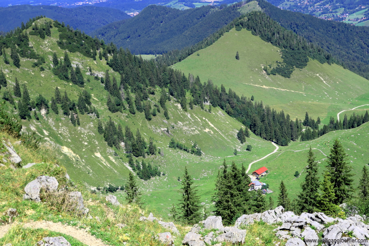 But again as always I have to get back to the valley floor. For me an important part of every hike is the visit of a cabin. So I descend on the eastern side of the peak to the Bodenschneid cabin. It’s not that far. On this side of the mountain the summit is cragged and rocky while on the other side it looks more like a rolling hill. The path is a bit steeper and runs through open terrain.