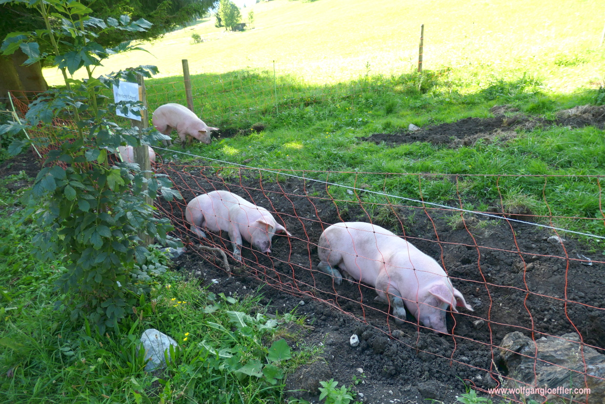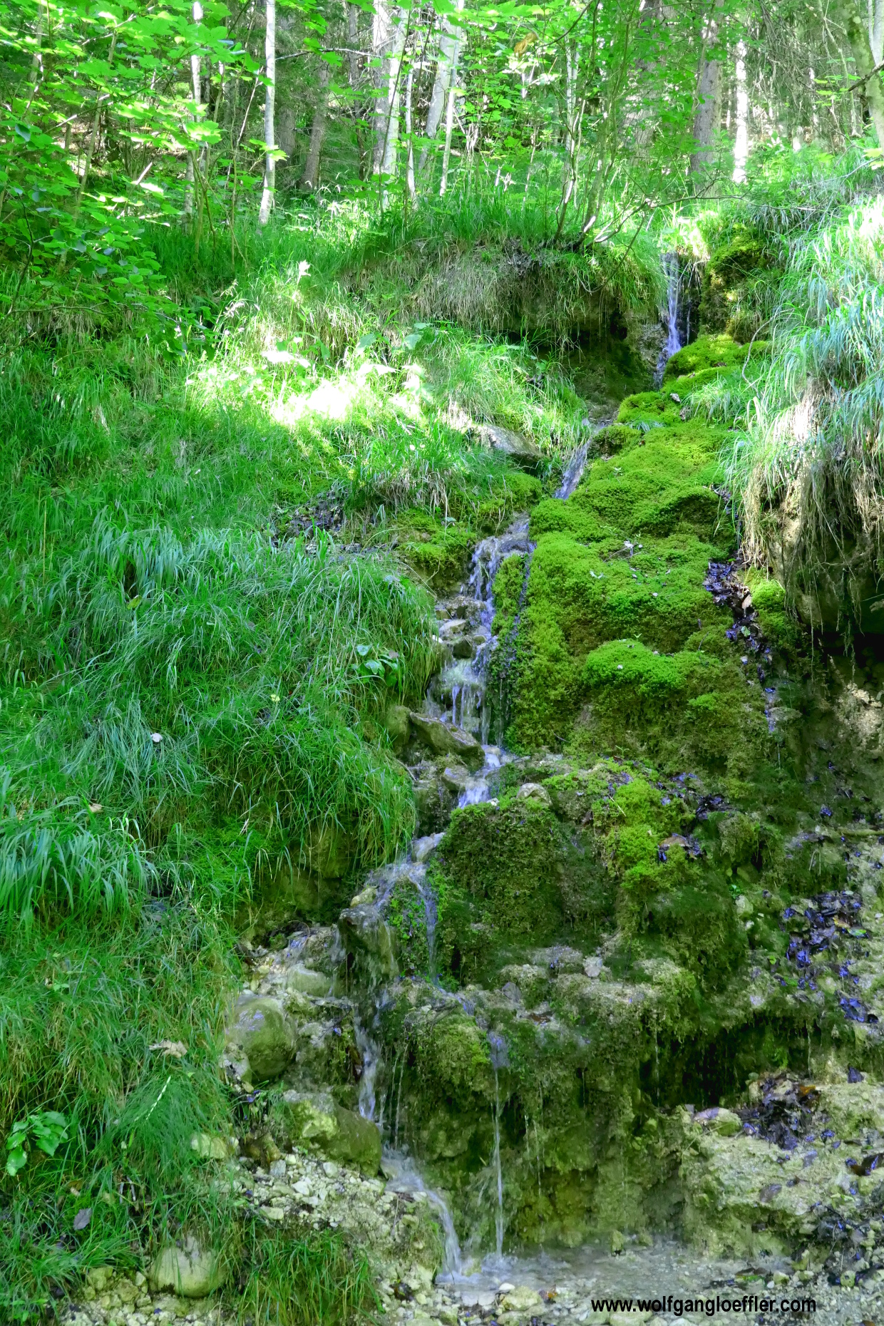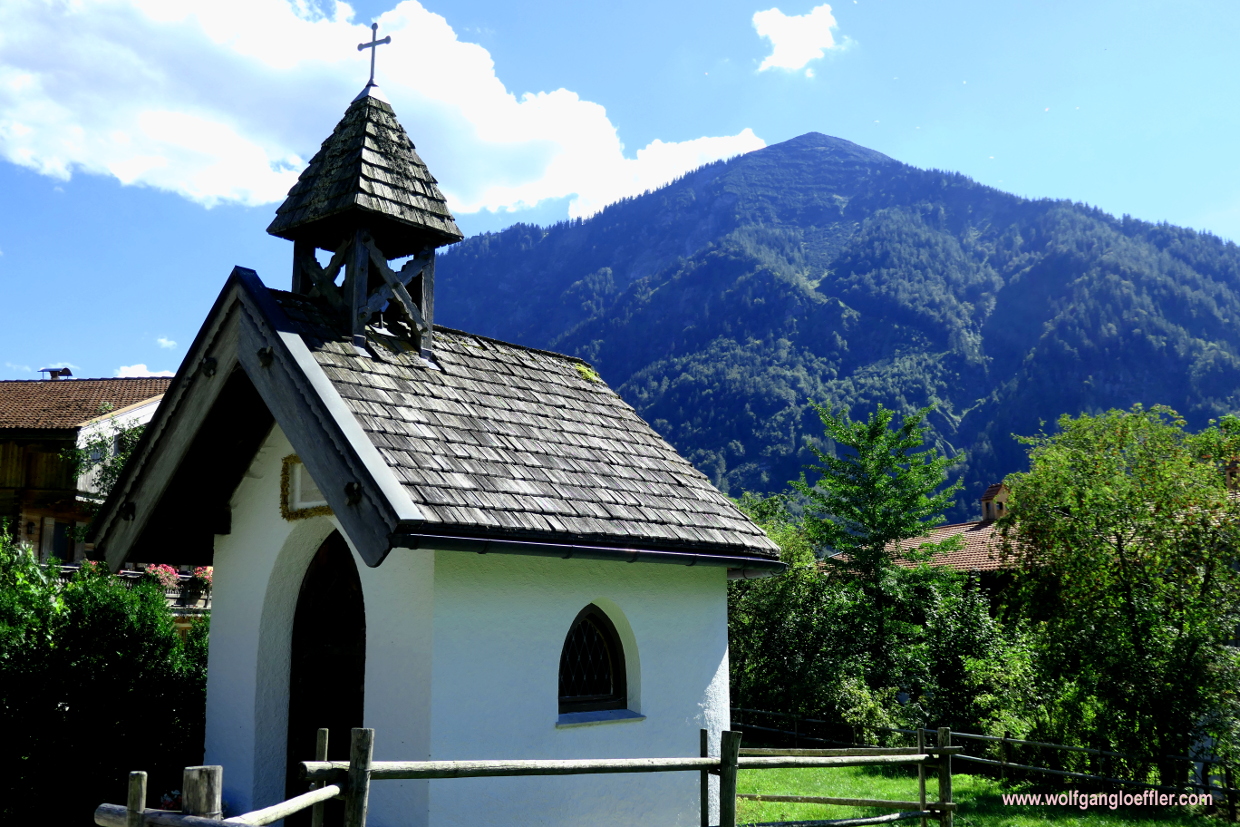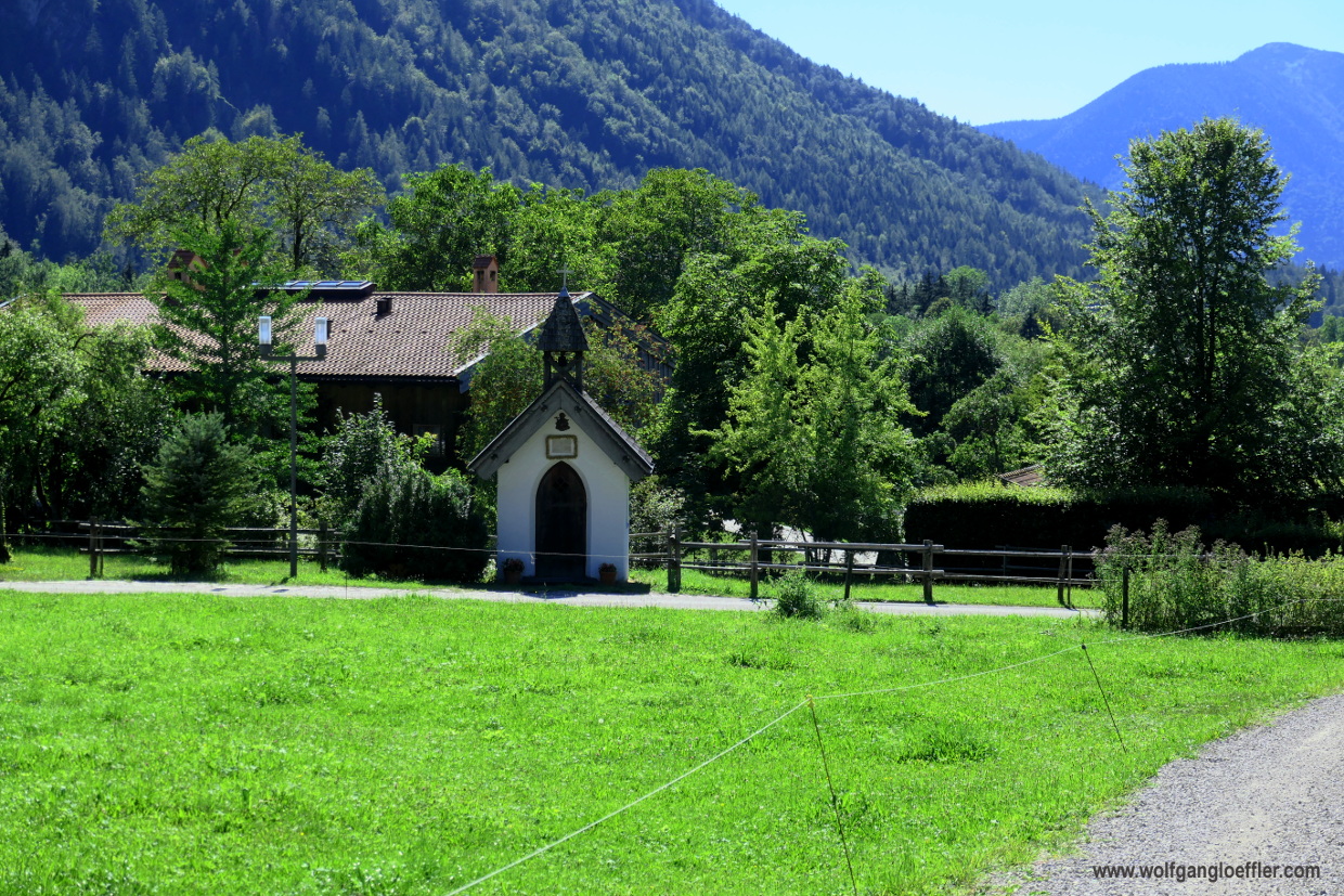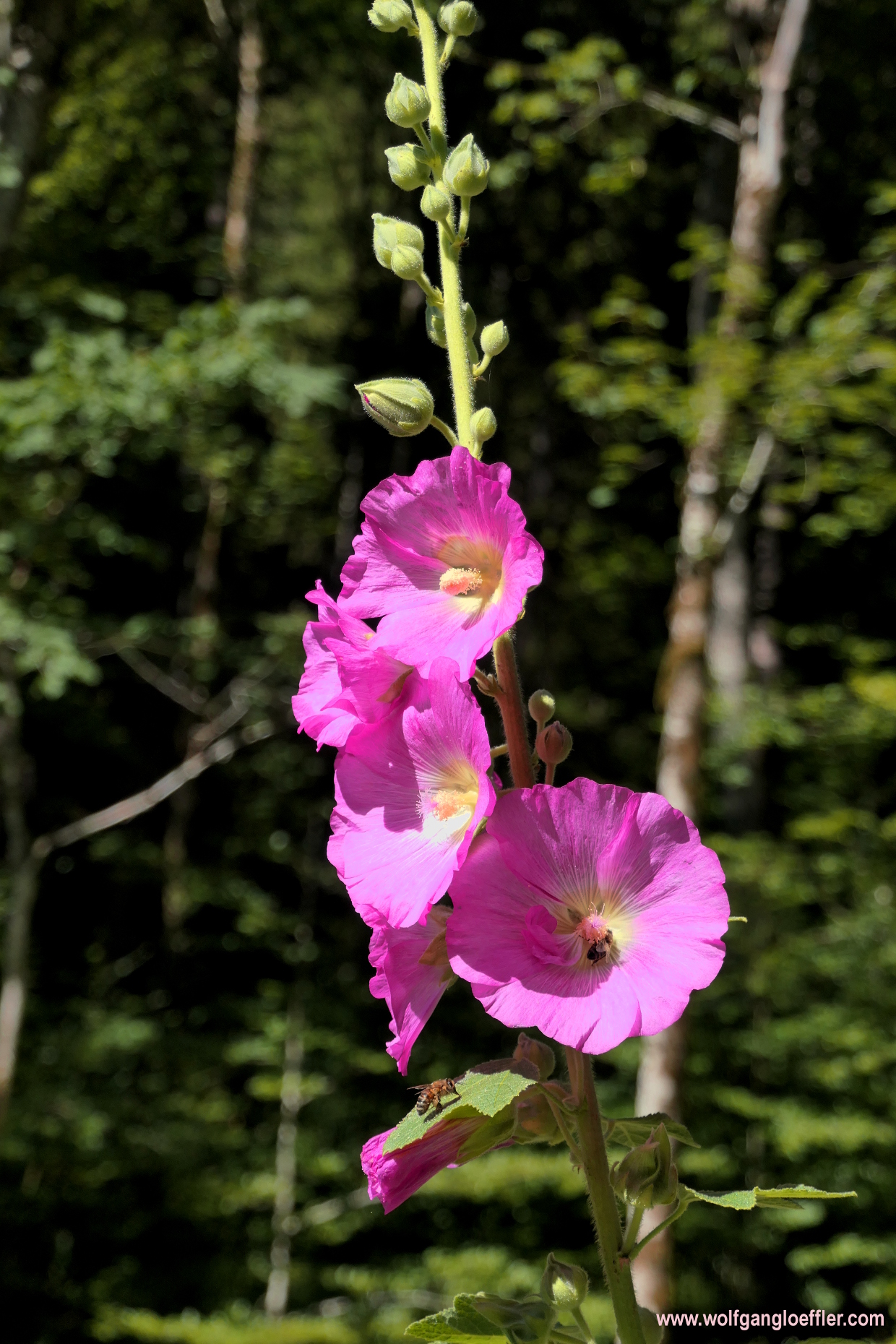 Just above the Kühzaglalm the trail comes out of the forest and I am looking on this alpine mountain farm with the Wallberg as a backdrop. On this farm they have a few pigs in an open space. They lead a happy life here. At least until the butcher is coming. But rather here then in one of those narrow stables. From the woods to my left a small creek is running downhill. It’s idyllic here. Just a few minutes later I reach a paved road in Erlach across from a small chapel. This road will bring me back to Enterrottach and my car. I am quite surprised to see a hollyhock growing here in the middle of the woods. So far I have seen them only in gardens.